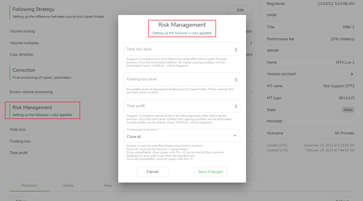 يمكن للمتابعين تعيين مستويات جني الأرباح ووقف الخسارة في إدارة المخاطر لإدارة مخاطر حساباتهم الخاصة.
