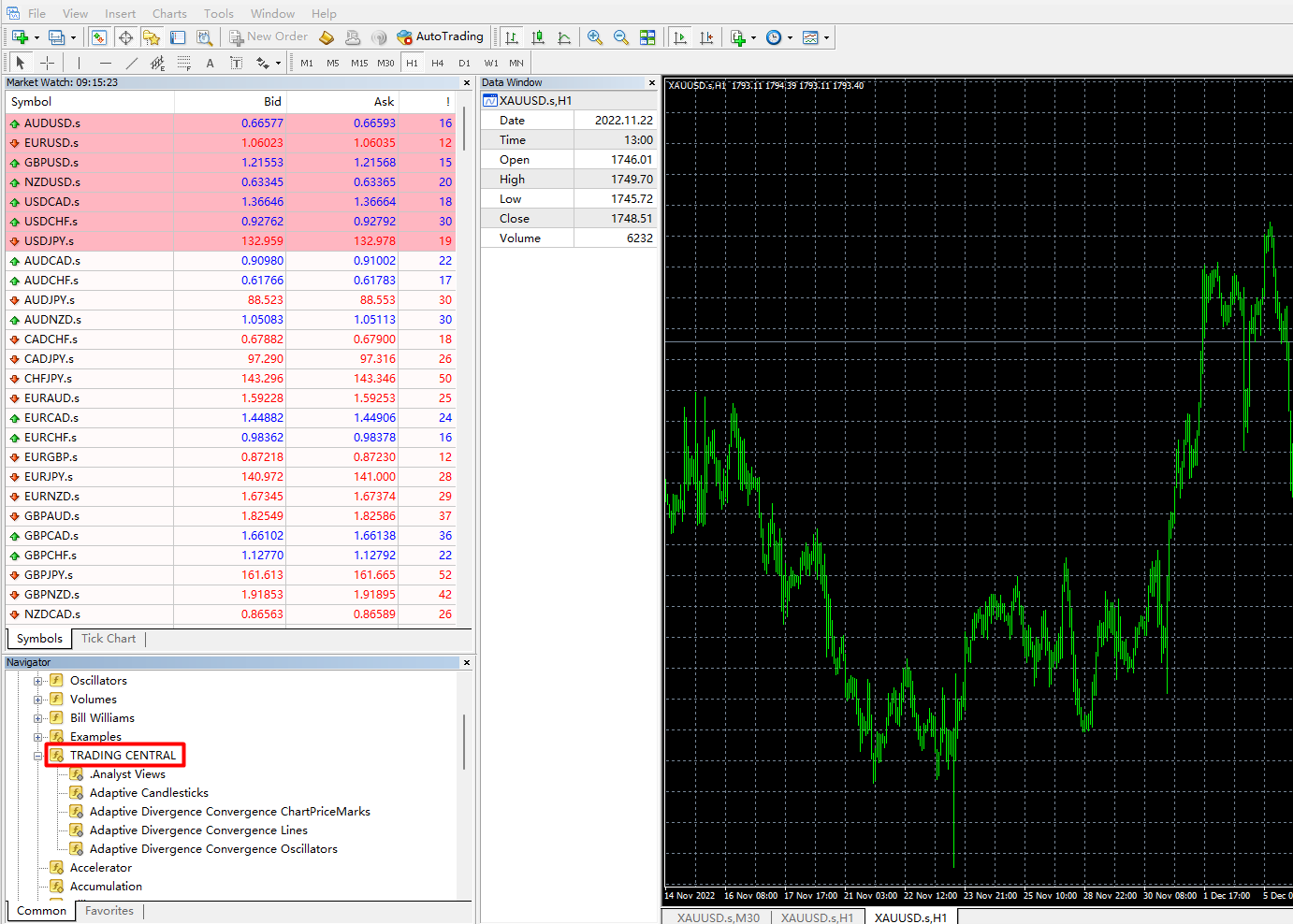 6. بعد إعادة تشغيل عميل MT4 الخاص بك ، يرجى النقر فوق "المؤشرات الفنية" على شريط التنقل الأيمن ، وحدد "Trading Central" وتصفح جميع المؤشرات.