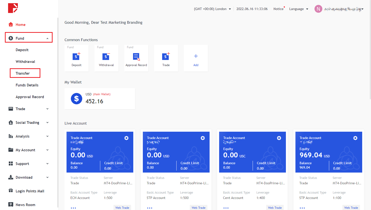 Visit the Doo Prime User Center and click "Transfer" in the left column of the homepage.