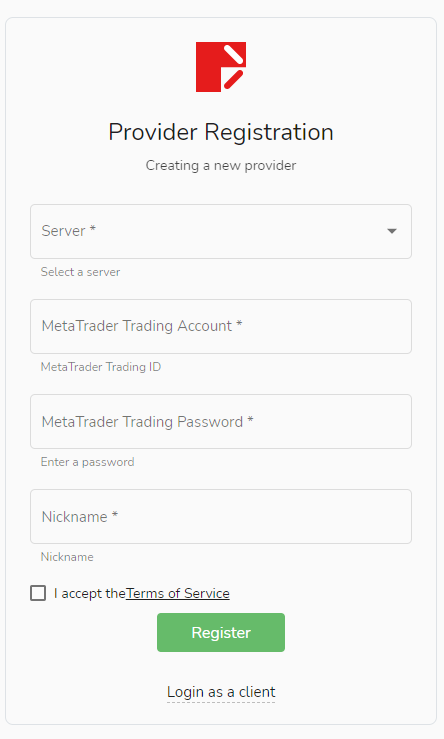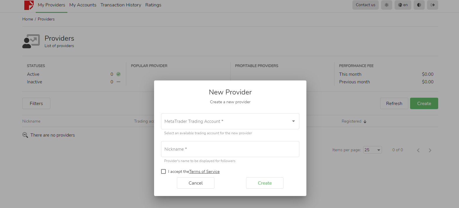 After successfully registering a signal source account, click [Create] on the homepage, then fill in [Trading Account] and [Nickname] again, and then check [Accept Terms of Service] to successfully add a signal source. Each signal source account can only add one signal source.