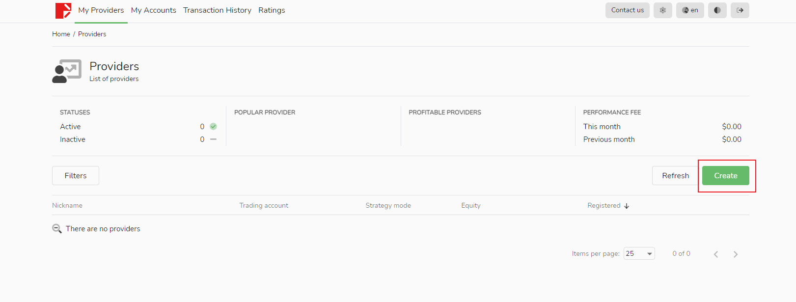 On the [My Account] page of the signal source, you can add a new trading account by clicking the green [Create] button. However, this account cannot be used to log in, and can only be selected as a signal source, follower or set up to receive performance fees.