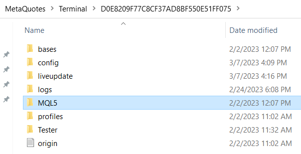2. Después de abrir el archivo MQL5 en la carpeta de datos, seleccione la carpeta de destino: