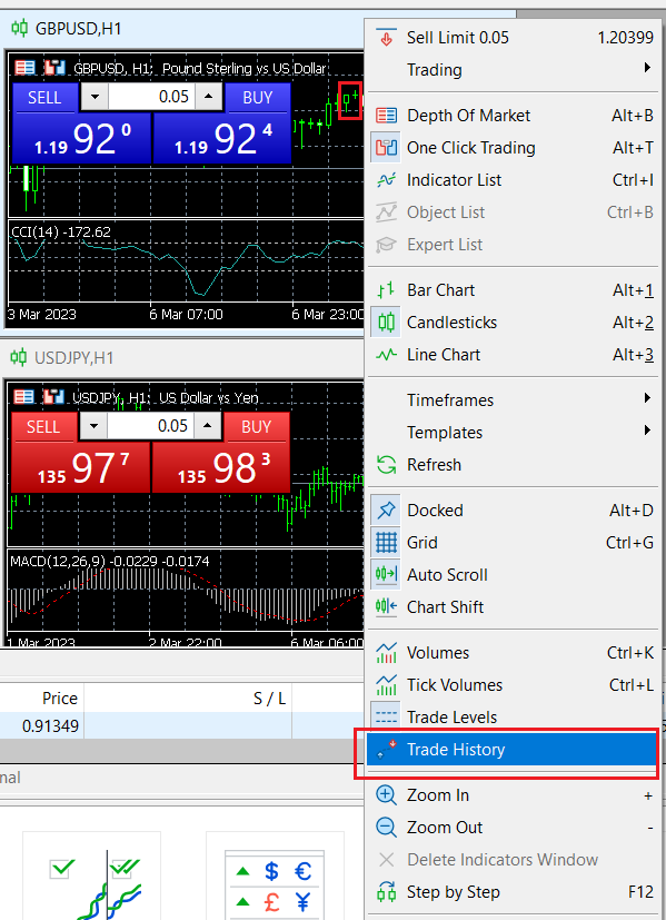 Si no necesita esta función, puede cerrarla de la siguiente manera: desplace el mouse sobre el espacio en blanco del gráfico, haga clic con el botón derecho y elimine el [Historial comercial] marcado: