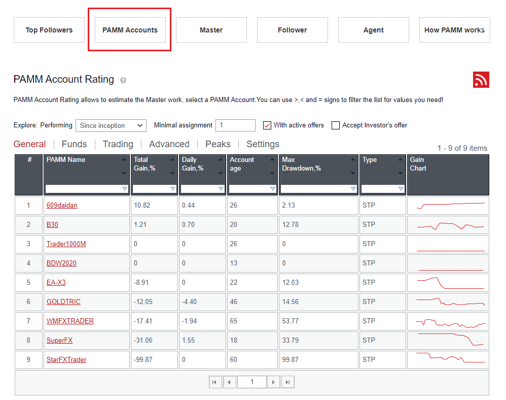 Para obter mais informações e resultados comerciais sobre um mestre, clique em seu nome PAMM para análise. Os parâmetros são divididos em cinco grupos: Geral, Financiamento, Negociação, Avançado, Pico e Configurações. Os usuários podem classificar e aplicar filtros em qualquer coluna.