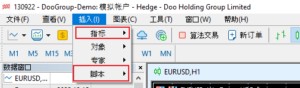 MT5 自帶多達38 種已經編寫好的技術指標,交易者可以自主設置、隨取隨用;在菜單欄中點擊【插入】,在【插入】選項中,選擇【指標】或者【腳本】然後點擊添加即可。
