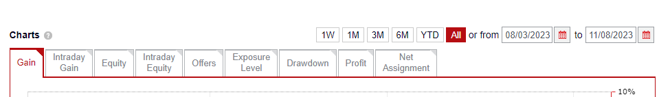 c. Nếu người dùng muốn tạo báo giá hoặc quản lý cài đặt của tài khoản Master, vui lòng nhấp vào tài khoản Master mong muốn trong danh sách tài khoản đang hoạt động để biết thêm chi tiết. Hệ thống sẽ tạo các biểu đồ hiển thị thu nhập, thu nhập trong ngày, vốn chủ sở hữu, báo giá, mức độ rủi ro, mức rút vốn tối đa, lợi nhuận và phân phối ròng cho tài khoản Chính đã chọn.